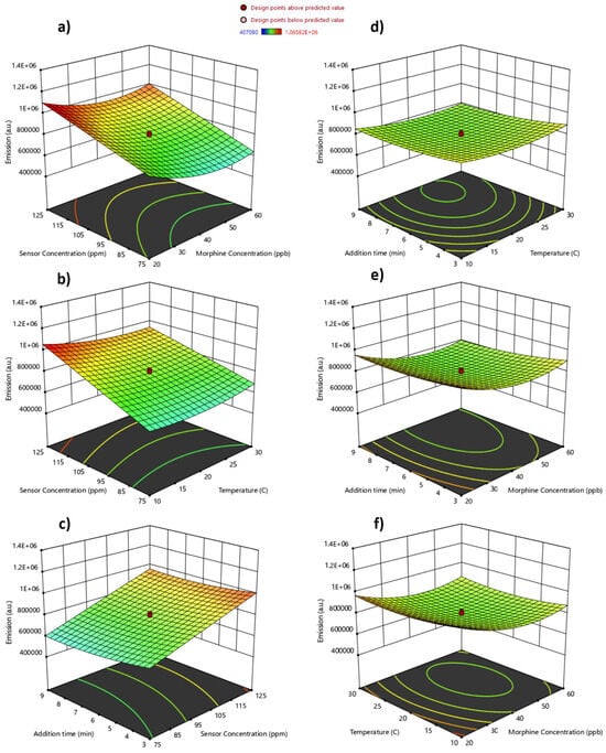 Three-dimensional plots of sensor’s fluorescence-emission response in urine samples: (a) interactive effect of morphine’s concentration and temperature; (b) interactive time and morphine’s concentration; (c) interactive effect of time and temperature; (d) interactive effect of sensor’s concentration and morphine’s concentration; (e) interactive effect of sensor’s concentration and temperature; (f) interactive effect of time and sensor’s concentration.