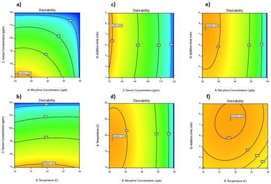 Two-dimensional desirability graphs versus actual points: (a) Actual factors include temperature at 18.53 °C and addition time at 7.47 min; (b) Actual factors include morphine’s concentration at 21.83 ppb and addition time at 7.47; (c) Actual factors include morphine’s concentration at 21.83 ppb and temperature at 18.53 °C (d) Actual factors include sensor’s concentration at 75 ppm and addition time at 7.47 min; (e) Actual factors include temperature at 18.53 °C and sensor’s concentration at 75 ppm; (f) Actual factors include morphine’s concentration at 21.83 ppb and sensor’s concentration at 75 ppm.