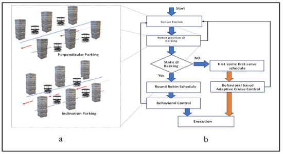 An overview of multi-robot backing crash prevention in an indoor environment is presented in the flowchart in Figure 1a,b. The system was initiated by sensing the signals with ultrasonic sensors, which were also used for sensor fusion. Sensor fusion data have been utilized for robot localization in various parking scenarios. Parking scenarios are mostly located in an indoor environment, such as perpendicular parking with and without inclination. Robots will analyze their parking position with respect to the environment in either normal perpendicular parking or inclination parking. The next level of the proposed system estimates whether the system is in static or dynamic conditions based on the environment. The static conditions of the scheduling-based priority task assignments were utilized while traversing from the parking lot to prevent multi-robot collisions during the backing traverse with respect to the red coloured arrows as shown in Figure 1a. In a generic manner, round-robin (RR) scheduling task assignments have been incorporated for static environments. When the multi-robots are out of the parking space, fail in communication, or if there is a delay in round-robin scheduling methods, it warns the system to accommodate the dynamically related algorithm to accomplish the task. In this situation, an individual robot is fitted with first come, first served (FCFS) scheduling along with an adaptive cruise control (ACC)-based behavioral control mechanism to avoid a backing crash. The execution of the proposed methodology is described with flowchart as shown in Figure 1b.