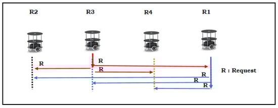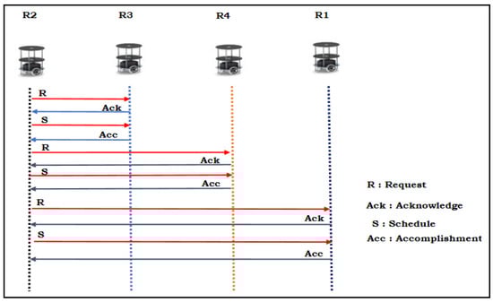 Figure 2 illustrates the round-robin scheduling algorithm for a multi-robot system in the execution of backing crash prevention under static conditions. In this scenario, the R2 robot acts as the leader, and the remaining robots act as followers. Once the static conditions are confined, the leader robot takes the lead and sends a schedule to each robot. In this case, the round-robin schedule is R3-R4-R1-R2 (top to lower sequence). In this process, the leader initializes communication with the request (R) instruction signal and waits for the response from the follower robots. The latter acknowledge (Ack) their acceptance of this schedule. Once the schedule (S) assigned to the follower robot begins executing the backing up from the parking position, it communicates with the leader robot after the accomplishment (Acc) of the backing up. In this process, in the event of any communication failure among the robot’s flock, the robot aims to execute the backing up method that it prefers using the first come, first served schedule, as shown in Figure 3. In this case, R3 and R1 both opt to execute backing up simultaneously. They communicate details about their exit to all robots. However, while transitioning from the parking space, they follow adaptive cruise control (ACC) by following Equations (1) and (2).