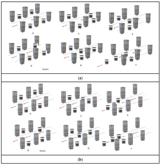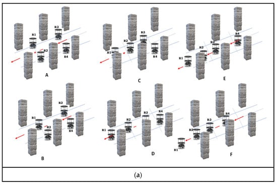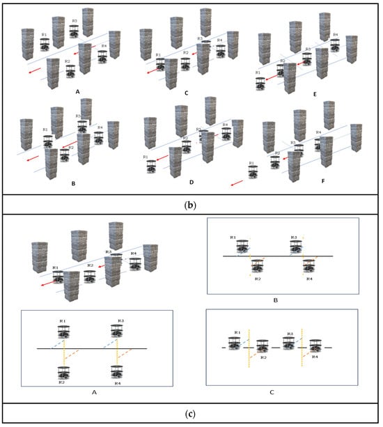 Under dynamic conditions, where each individual robot has distinct prior tasks to fulfill, all the robots must kick start from parking. In such a scenario, the first come, first served (FCFS) method and adaptive cruise control (ACC) integration provide the best solution under dynamic conditions. At every moment, the algorithm makes a decision based on the movement of the robots, and while approaching the objects, the scenario is static or dynamic based on the sensory fusion of the ultrasonic sensors (lines 2 to 8). The dynamic condition is defined based on the difference in velocity and distance between the current robot and other robots/objects in the environment (line 7). The dynamic behavioral control approach is mentioned in lines 9–14. According to this approach, robots are classified as odd (R1, R3) and even-type (R2, R4) robots. The robots positioned on the left side of the plane are assigned odd numbers, and the other side is assigned even numbers (line 10) and their back traversing of all robots have been represented with red coloured arrows as shown in Figure 5a(A–F),b(A–F).