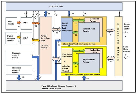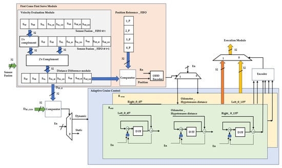 The environment was sensitized using ultrasonic sensors with a digital compass, which was communicated between the multi-robots using the ESP8266 Wi-Fi module manufactured by Espressif Systems in Shanghai, China and interfaced with a UART 32-bit module operated at 9600 baud rates. Ultrasonic sensors were initiated using a control unit every 1/3 s, and echo signals were digitized into a distance using the pulse–width modulation technique. The ultrasonic sensor distances stored in the 32 × 108 (width and depth) FIFO module and AXI-based FIFO control were integrated into the sensor fusion module, as shown in Figure 6. The 32-bit data are driven out of the module, which is integrated with AXI-based FIFO control data of 12 bits and appended with the original 20-bit distance. The control data of 12 bits define the respective sensor and its position on the robot. The proposed approach was integrated for both static and dynamic scenarios. In the static scenario, multi-robots prefer round-robin-type task assignments while performing backing-up from the parking space. Similarly, while performing in dynamic scenarios, FCFS and ACC methods have guided multi-robots to avoid crashes between other robots and the environment. The entire system is operated under event-based conditions using the control unit, and it synchronizes various frequencies and interfaces. The novelty of the proposed method was achieved with the effective utilization of partial reconfiguration tools of Xilinx to decrease power consumption and obtain effective synchronization. The executive module was embedded with a motor control for both the stepper and servomotors.