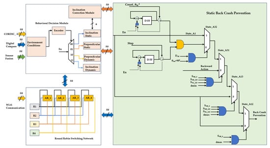 Figure 7 presents backing-up crash prevention in the static scenario, which is embedded with the behavioral decision module, the round-robin (RR) switching network module, and the static backing crash module. The behavioral decision module is part of the partial reconfiguration module, which determines the selection of static and dynamic approaches. The robot angular values were evaluated using a digital compass with respect to onboard real-time, and the Xilinx CORDIC IP core (acts as the reference angle) was utilized for next-level digitization. The behavioral decision module estimates the localization of the robot in either perpendicular or inclination parking under static and dynamic conditions. For inclination parking, it corrects its angular position into a straight-line approach using real-time digital compass data and CORDIC IP cores.