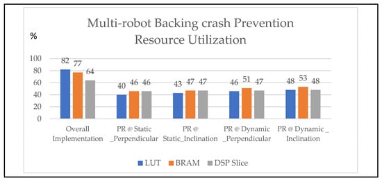In this study, the research contributions are the algorithms for the prevention of backing-up crashes of multi-robots using novel hardware schemes and partial reconfiguration (PR) methods. The state of the art in this research work is as follows: estimation of the multi-robot positions in versatile environments, such as perpendicular and inclination parking. Hardware schemes for scheduling methods, such as the round-robin (RR) method, have been used for communicating to exit from parking spaces by multi-robots to prevent backing-up crashes in static scenarios. The behavioral control mechanism was integrated with the first come, first served (FCFS) and adaptive cruise control (ACC) algorithms to enable performance in dynamic scenarios. This was coded using Verilog HDL and tools with Xilinx Vivado, and the schemes were deployed in multi-robots embedded with a Zed board FPGA as an edge computational device. The system was validated in two ways: general flow and PR flow. The device utilization was very high in general flow: 82% of look-up tables (LUTs), 77% of Block RAM (BRAM), and 64% of DSP Slices were occupied. In this regard, the PR flow provided optimized device utilization of 40–48% of LUTs, 46–53% of BRAM, and 46–48% of DSP slices for both static and dynamic scenarios. Proportionally, the device utilization affected the static power consumption of the general flow, which was 2.4 watts, and the PR flow, which ranged from 1.26 to 1.4 watts. The future scope of this work is the implementation of backing-up crash prevention for n robots in indoor environments.