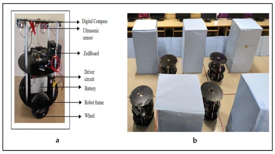 Mobile robots were fitted with mechanical, electrical, and computational devices. Four pairs of ultrasonic sensors were positioned in the four directions of each robot and spaced every 90°. The left and right sides of each robot were deployed on a servo motor. Each robot was powered using 24 volt and 7 amp lead acid batteries. The battery voltages were downsampled to 5 V using the voltage regulator module 7805 and supplied as a source for the electronic components and computational devices. Stepper motors were positioned on both sides of each robot’s frame. For the frame, the bottom layer was embedded with stepper motors, the top layer positioned with batteries, and the next layer positioned with electronic components and computational devices. The top layer’s sides were interfaced with the sensors and digital compass. The complete experimental setup of the mobile robot is shown in Figure 11a. The environment of the experimental setup is shown in Figure 11b.
