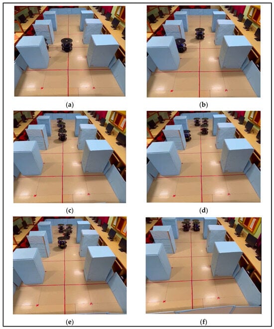 (a–f) Experimental results of static backing-up crash prevention with multi-robots.