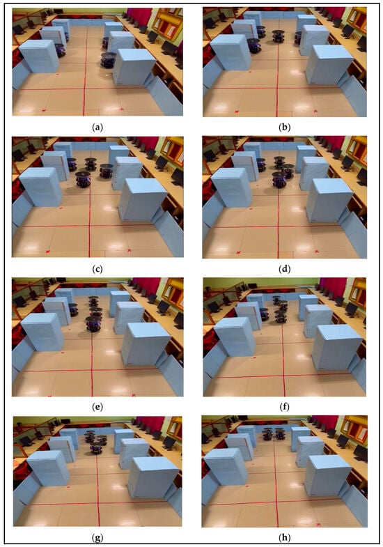 Dynamic backing-up crash prevention was validated through the experimental results, as illustrated in Figure 13a–h. The dynamic backing crash was accomplished using the hardware schemes of the FCFS and ACC, as shown in Figure 8. In this experiment, all robots were trying to exit parking spaces. The FCFS method was applied to each robot, its position in the environment was identified, and the ACC rules were applied. Once initialized, R3 took its position as the lead between R4 and R3. R4 applied the ACC rule as stop-and-go, as illustrated in Figure 13a. While R4 was prepared for its position and movement, R1 intermittently took the environmental lead and accomplished its backing crash prevention task. Once again, R4 was waited for until R1 accomplished its task using the ACC rule. R2 was completely blocked by all robots in accomplishing the exit from the parking space using dynamic backing-up crash prevention. In this regard, R2 exited last and joined the group as per the next level application, and Figure 13a–h presents the same flow. The same experimental demonstration was posted on M.C.C.’s YouTube channel: https://www.youtube.com/watch?v=T_e9dIBJHi0 (accessed on 18 January 2024). Similarly, when robots were in an inclined parking space, they initially corrected their positions and executed actions in a line formation, as shown in Figure 13a–f.