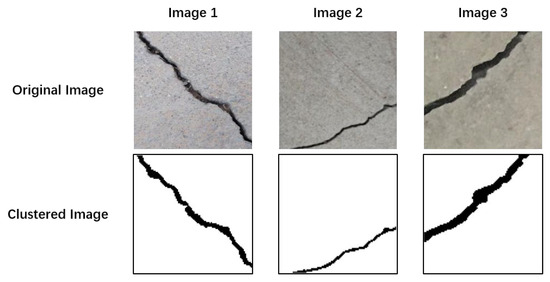 - Initialize Cluster Centers: The Otsu algorithm is used to determine the initial cluster centers in the clustering algorithm. In addition, it is employed to determine the threshold used as the filtering criterion for initializing the cluster centers. Given that concrete cracks typically involve grayscale level transitions between two adjacent regions with different grayscale levels, an appropriate threshold is derived from the average values of these two regions. Leveraging the Otsu algorithm, an efficient image segmentation method, expedites the convergence of the algorithm by selecting the threshold determined by Otsu as the initial cluster center. This strategy not only improves the quality of the initial cluster centers by achieving rapid initialization, reducing iteration times, and preventing convergence to local optima, but also leverages the advantages of the Otsu algorithm in image data processing, thereby enhancing the efficiency and accuracy of the initialization process.