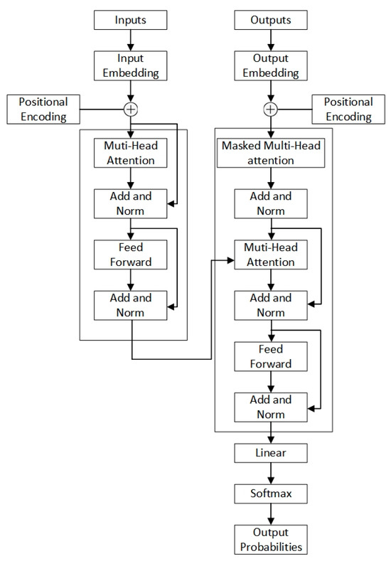 The transformer architecture consisted of decoder and encoder components, as depicted in Figure 3. Both types of components used multi-head self-attention layers, pointwise feedforward layers, and fully connected layers. First, the input sequence was mapped by the encoder into a high-dimensional representation that encoded contextual interdependencies. The decoder then condensed this representation into the target output sequence, using masked self-attention to avoid information leakage. Modeling of long-range temporal relationships was enabled by attention in the data; nonlinear feature transformation was executed by the feedforward layers [20].