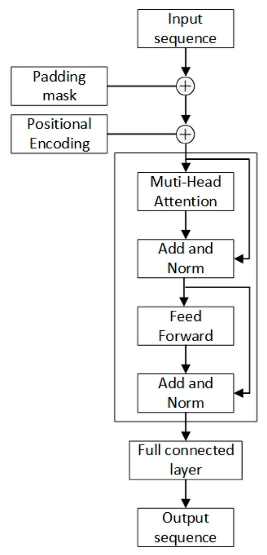 As illustrated in Figure 3, the encoder consisted of stacked identical encoder layers. Each encoder layer was composed of two sublayers: a multi-head self-attention mechanism, followed by a position-wise feedforward neural network. The attention sublayer output was fed into the feedforward network, which used the same transformation at each sequence position. The two sublayers were connected with a residual connection and were then subjected to layer normalization.