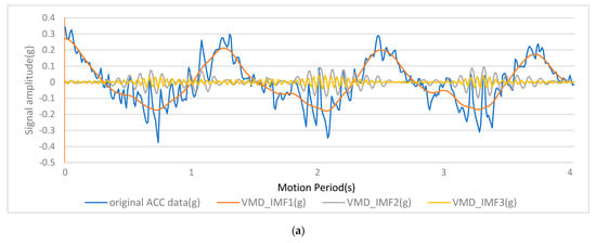 Mechanomyography (MMG) signals consist of low-frequency (10–50 Hz) muscular vibrations that are elicited throughout contractions. However, raw MMG recordings obtained using accelerometers contain high-frequency noise and motion artifacts. For the present study, then, signal decomposition was required to isolate the underlying MMG information. To this end, variational mode decomposition (VMD) was used. This involved an algorithm that separated a signal recursively into separate frequency–domain components by solving a constrained variational problem to minimize the mode bandwidths [8,9]. Compared to empirical mode decomposition (EMD), another method widely used for nonstationary signal analysis [10,11], VMD is characterized by greater sampling consistency and better noise robustness.