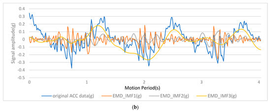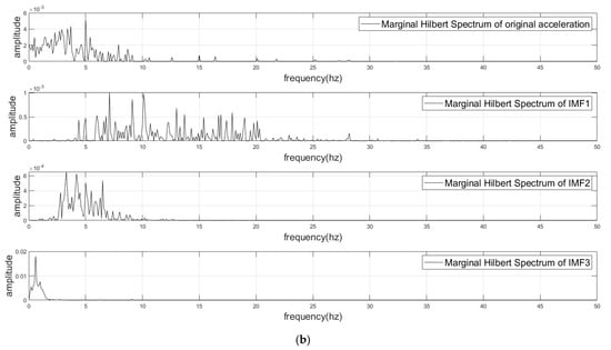 DE-VMD was utilized to separate the pseudo-accelerations of joints and mechanomyography (MMG) signals from raw accelerometer data, as described above. Case decomposition results are shown in Figure 5 and Figure 6. The results for the original acceleration, pseudo-acceleration, and two IMFs, which are components of MMG, are depicted in Figure 5a. IMF1 was pseudo-acceleration, and IMF2 and IMF3 were components of MMG. The Marginal Hilbert Spectrum of corresponding components is shown in Figure 6a, which reflect the frequency–domain energy distribution. An examination of the figure revealed the effective isolation of the MMG signal (10–50 Hz) from higher-frequency noise and lower-frequency motion artifacts. The Marginal Hilbert Spectrum is a two-dimensional representation derived from the Hilbert spectrum; it shows the total energy contribution of each frequency value. The Marginal Hilbert Spectrum helped us understand the energy distribution across different frequencies in a signal, making it a valuable tool for various applications, including analyzing blood flow, climatic features, and water waves [22,23,24]. The efficacy of DE-VMD was compared to that of alternative methods such as empirical mode decomposition (EMD) with respect to information preservation and artifact rejection.