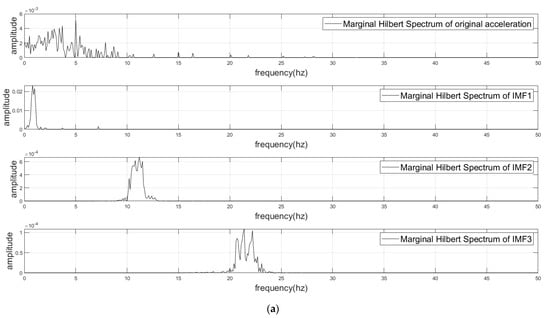 As previously mentioned, EMD is a method widely utilized for nonstationary signal decomposition. Unlike wavelet and Fourier transforms, which make use of predefined basis functions, EMD is data-driven and intrinsically adapts to signal characteristics. This delivers all the advantages associated with the nonlinear processing of nonstationary data with high noise levels. In the present study, for comparative purposes, EMD was applied to extract MMG signals, and the results are depicted in Figure 5 and Figure 6. The results for raw acceleration, extracted MMG, and low-frequency residue signal are displayed in Figure 5b. IMF1 and IMF2 were components of MMG, and IMF3 was a low-frequency residue signal. The Marginal Hilbert Spectrum of the corresponding components is displayed in Figure 6b. An examination of the figure showed that the EMD-derived MMG exhibits greater randomness and more dispersed spectral content in comparison with the DE-VMD extraction.