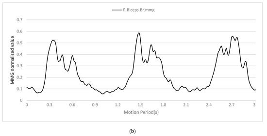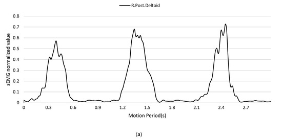 The self-determined movements of participants enabled us to assess the ability of the models to generalize across movement speeds. To this end, for each physical exercise in the present study, 20 sets of 10 repetitions were completed by the participants, with 2–3 min of rest between sets to prevent fatigue. MMG and sEMG signals were acquired from the biceps brachii, anterior deltoid muscle, middle deltoid muscle, and posterior deltoid muscle using 4 special sensors. The arrangement of the sensors is shown in Figure 1a. Simultaneously, shoulder and elbow 3D rotational accelerations were recorded utilizing an optical gesture capture system. The prescribed movements were executed by participants upon instruction, and the data were collected. This level of physical exercise was sufficient for an initial validation. Greater robustness in the results might be obtained with more demanding exercise regimens; nevertheless, we believed that our preliminary research could offer indicative evidence of the proposed methodology’s utility and contribute to the search for a more rigorous experimental design.