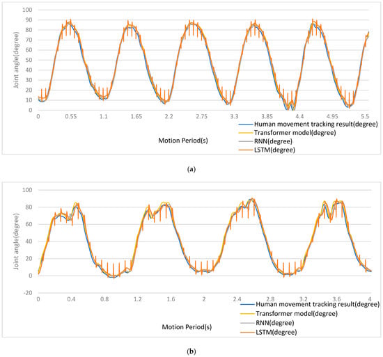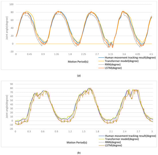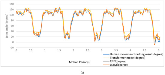 A comparison between the results for the recognition of joint acceleration obtained using the algorithm proposed here and those obtained using traditional algorithms is presented in Figure 9 and Table 1. In the figure, the blue curves are real joint acceleration signals of 3D movement experimentally captured, the yellow curves are estimation results of the transformer model, the gray curves are estimation results of the RNN model, and the brown curves are estimation results of the LSTM model. It can be seen that the transformer model produced the best estimates of joint acceleration, with the lowest rate of overall error among the algorithms, as shown by an estimation curve, which was smooth and without mutation.