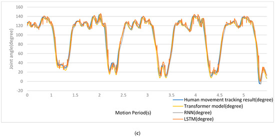 A comparison between the results for joint acceleration recognition obtained using the algorithm newly proposed here and those obtained using traditional algorithms is presented in Figure 10 and Table 2. In the figure, the blue curves are real joint acceleration signals of 3D movement experimentally captured, the yellow curves are the estimation results of the transformer model, the gray curves are estimation results of the RNN model, and the brown curves are estimation results of the LSTM model. It can be seen that the transformer model produced the best estimates of joint acceleration, with the lowest rate of overall error among the algorithms.