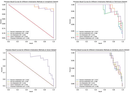 The confusion matrices, ROC curves, and PR curves offer additional insights into the classification performance of DNM with different weight initialization methods. Figure 7 and Figure 8 display these evaluation metrics for each dataset.
