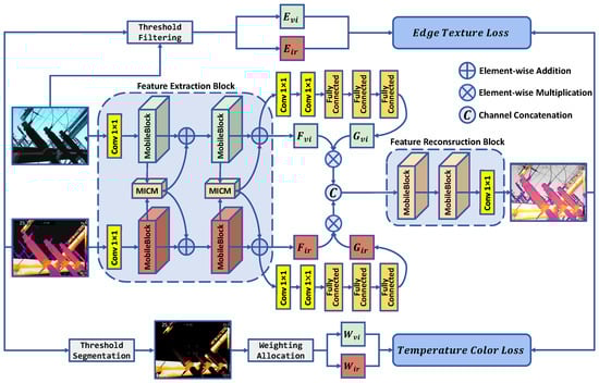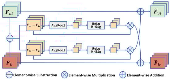 Additionally, as shown in Figure 3, a multispectral information complementary module (MICM) was designed to amplify the differences between infrared and visible images. The difference information is then, respectively, added to their own features to achieve the complementary module. The multispectral information complementary module can be defined in (4) and (5).