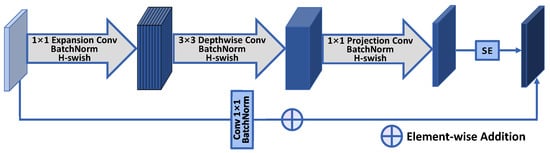 The MobileBlock structure consists of five modules: dilated convolution layer, depthwise separable convolution layer, mapping convolution layer, residual connection, and SE layer []. The first module is the dilated convolution layer. It expands the number of channels of the input feature map by a dilation factor t through a 1 × 1 convolution kernel. This introduces more channel information with a relatively low computational cost. In the depthwise separable convolution layer, each input channel is convolved with an independent 3 × 3 kernel, generating an intermediate feature map with the same number of channels. This allows feature extraction from each channel without additional computation. Next, the mapping convolution layer performs a 1 × 1 convolution on the intermediate feature map to map the channels to the desired output channels. This is equivalent to linearly combining each pixel across channels to fuse information. The residual connection adds the input and the output of the three convolution layers through a 1 × 1 convolution. This facilitates feature reuse and strengthens representational capacity.