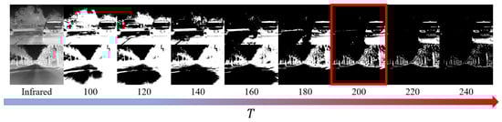 Using a threshold-based approach for segmenting the infrared image aims to extract significant regions. Considering the linear relationship between the grayscale values in thermal infrared images and the temperature they represent [], the value of T is initially set within the range of 100–240. The evolution of significant region extraction is studied as the threshold value T is progressively varied.