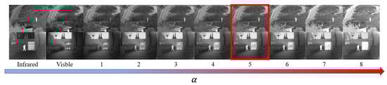 With the T value fixed, the optimal high-temperature ratio in the infrared image can then be calculated using the above formula. In the next step, the optimal value of is determined, weights for the infrared and visible features are calculated, and model training proceeds. The value of is gradually adjusted, and 4320 pairs of images from the MSRS dataset are used for training, with testing and analysis conducted on the TNO dataset. Some of the subjective fusion results are shown in the figure below. It can be observed that , as the scaling factor in the formula, largely determines the weight of infrared and visible features. When is small, the weight of the infrared features is small, and the fusion result tends to favor the visible image, losing the infrared features. Conversely, when is large, the fusion result incorporates too much infrared information, leading to spectral contamination. Ultimately, the value of is set to 5, as it best balances the weights of the infrared and visible features and highlights significant targets in the fused image. Additionally, objective results indicate that setting to 5 yields optimal image quality metrics, as shown in Table 3.