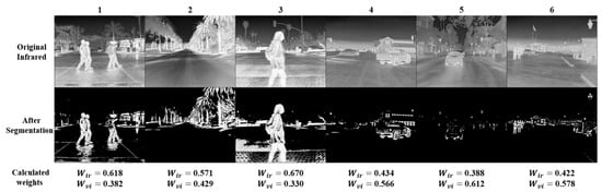 Finally, with the determined hyperparameter values, the weights can be calculated, and partial results are shown in Figure 6. It can be observed that, in infrared images 1, 2, and 3, where there is a higher amount of thermal information, larger weights are calculated after segmentation for the infrared image. In contrast, in infrared images 4, 5, and 6, where there is less thermal information, smaller weights are calculated for the infrared image. Therefore, in image pairs with more temperature information, the fused image will highlight the infrared image more prominently. In image pairs with less temperature information, the fused image will emphasize the visible image more prominently. This aligns with the proposed temperature-guided mechanism module.