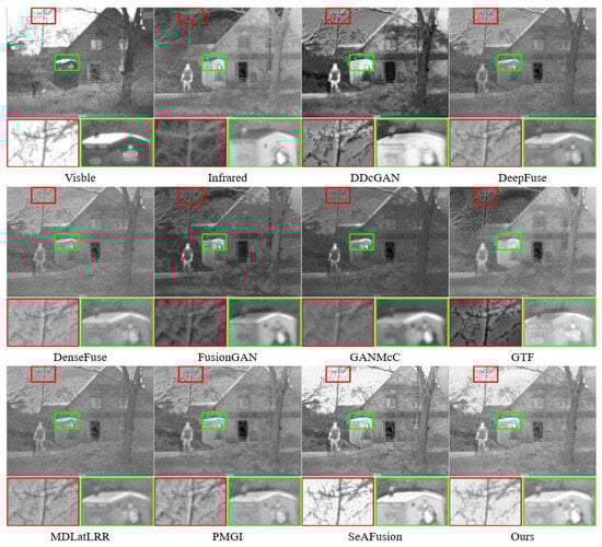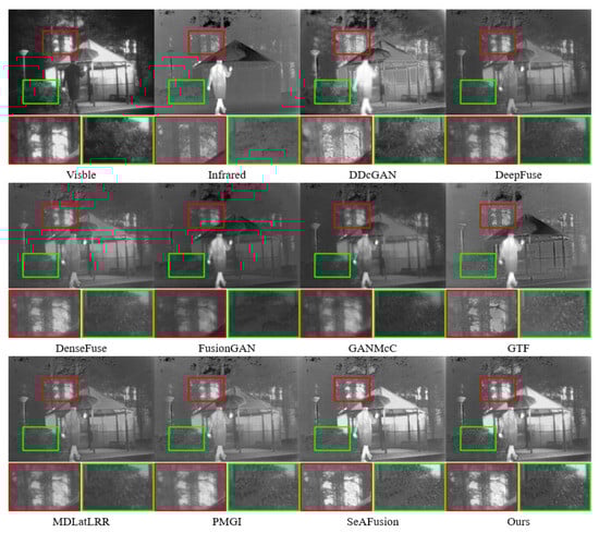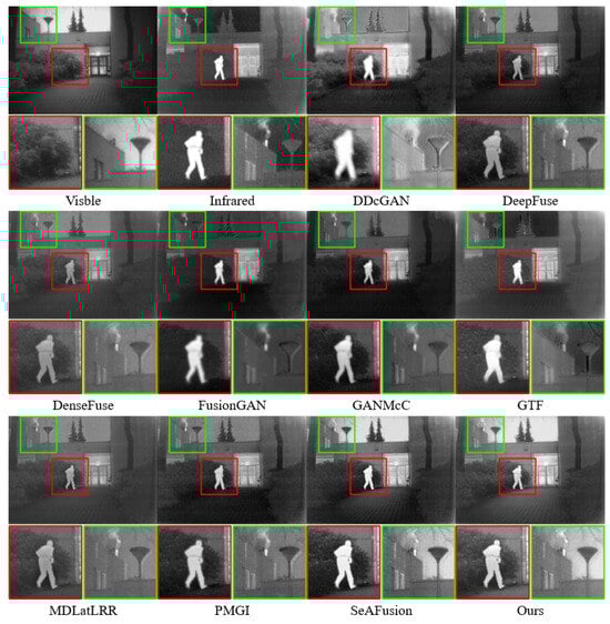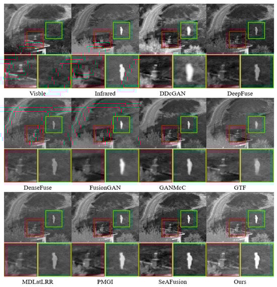 After fixing the values of T and , the model obtained through training is the best-performing fusion model. Subsequently, the fusion performance of the model was further tested using the TNO dataset, employing both subjective observations and objective metric evaluations. Additionally, several mainstream fusion algorithms were selected for comparison. Sets of fusion results on the TNO dataset are shown in the figure below.