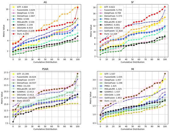 Table 5 presents the comparative results of four fusion image evaluation metrics, SF, AG, MI, and PSNR, for 50 pairs of high-quality electric power equipment infrared–visible image pairs. In the table, red indicates the best values, and blue indicates the second-best values. It is noteworthy that our method exhibits a significant advantage in three of the metrics. The highest SF and second-highest AG values suggest that the fused images have the best preservation of edges and textures and appear sharper and clearer visually. The highest MI and PSNR values indicate a high level of consistency between the fused image and the source image, with lower distortion. This indicates that the fusion algorithm can effectively transfer the most spectral information from the source image to the fused image based on temperature conditions, reducing information loss and maintaining the quality and details of the source image. Furthermore, as shown in Figure 14, our method consistently demonstrates the best performance across all metrics, reflecting its superiority in various aspects of fusion algorithm performance.
