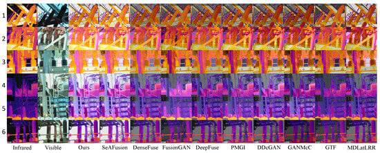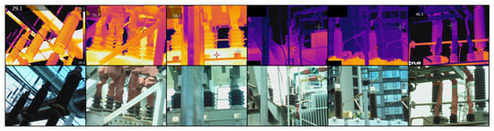 The self-constructed dataset of electric power equipment images is shown in Figure 12. This dataset comprises 752 pairs of infrared–visible images of electric power equipment, registered using a contour angle directional method []. These images were captured using FLIR thermal infrared sensors. Among these pairs, 441 images belong to high-temperature equipment, indicating the presence of higher temperature information and significant areas in the infrared images, while 311 images are associated with low-temperature equipment, representing less temperature information and significant areas in the infrared images. The image resolution is 640 × 480. During the fusion process, the infrared images were first transformed into the YCbCr color space. Then, the fusion model combined the Y channel of the infrared image with the visible image to create the fused image. Finally, the fused image was transformed into the RGB color space by combining it with the Cb and Cr channels from the infrared image [].