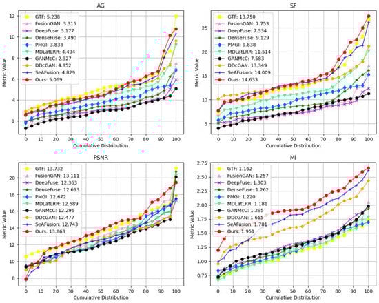 Quantitative comparisons of the four metrics on 20 image pairs from the TNO dataset. A point on the curve denotes that of image pairs have metric values that are no more than y.