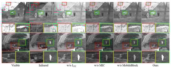 Table 7 and Figure 15 shows that, after removing the temperature-color-perception loss function, all metrics significantly decreased. The fused image lost more information, pixel values were more concentrated, contrast was lower, differences between the fused image and the original image increased, and image sharpness and fidelity decreased. This indicates that our temperature-color-perception loss function effectively adapts the contributions of infrared and visible light by preserving more information-rich parts.