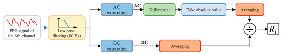 where and are the amplitude strengths of alternating current (AC) and direct current (DC) of the PPG signal obtained by wavelength of , respectively.