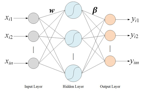 Extreme Learning Machine (ELM) [17] is a single hidden layer feedforward neural network algorithm, as shown in Figure 5, that is often used to solve the problems of classification and regression. The weights between the input layer and the hidden layer are randomly initialized and remain unchanged, the weights between the hidden layer and the output layer are calculated during the model training process. The whole process does not require complex iterations and parameter tuning, so ELM has a faster training speed compared with traditional neural network algorithms. In addition, there are only two hyperparameters, the number of nodes in the hidden layer and the activation function.