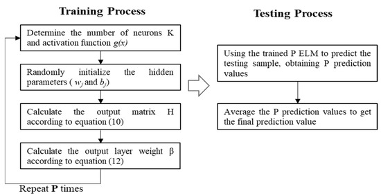 The regression model was established based on the ELM algorithm, which is a single hidden layer feedforward neural network algorithm. The ELM algorithm has excellent nonlinear fitting performance in classification and regression tasks, and it does not require complex iterations and parameter tuning, so ELM has a faster training speed compared with traditional neural network algorithms. However, the weight parameters are randomly initialized, which may lead to instability in the prediction results. To address this problem and improve the stability of the model, we established multiple independent ELM regression models and then integrated the results obtained by each ELM.