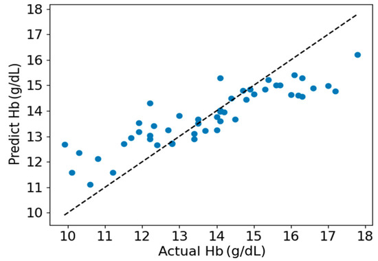 The performance of the proposed method was visually presented in Figure 7 and Figure 8. It is apparent from these figures that hemoglobin values within the range of 13 g/dL to 15 g/dL demonstrate relatively high prediction accuracy, whereas values outside this range exhibit lower prediction accuracy. This observation can be attributed to the abundance of samples with hemoglobin values falling within the 13 g/dL to 15 g/dL range. A sufficient sample quantity ensures diversity in features extracted from PPG signals, thereby contributing to the construction of a robust model for hemoglobin prediction. Conversely, the inadequate number of samples with hemoglobin values outside the range of 13 g/dL to 15 g/dL results in a lack of diversity in feature sets, compromising the robustness of the constructed model for predicting hemoglobin values.