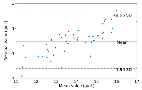 The Bland Altman plot [19] is used to estimate the consistency between two Hb measurement methods (invasive and non-invasive). Generally speaking, the method is considered reliable when most of the observed differences are within the 95% consensus range (±1.96 standard deviation).