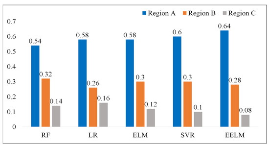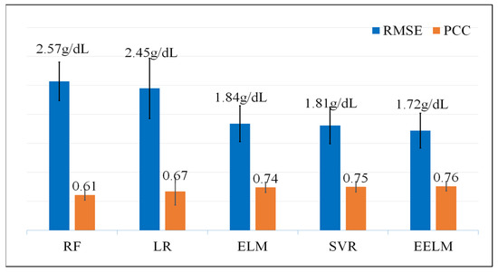 Figure 9 shows the RMSE and PCC values of the five different algorithms. The EELM model outperforms the other four models in both evaluation indicators, getting the best performance RMSE of 1.72 g/dL and PCC of 0.76 (p < 0.01).