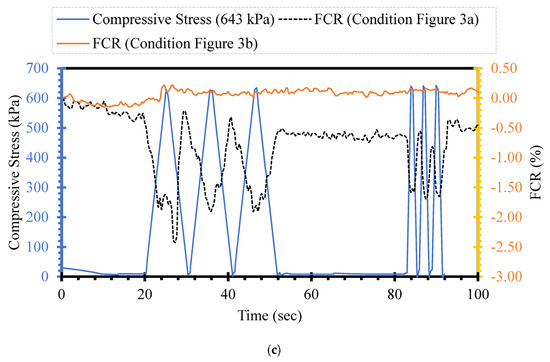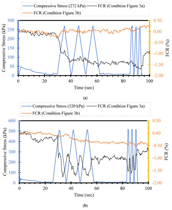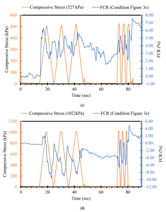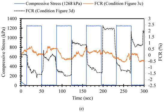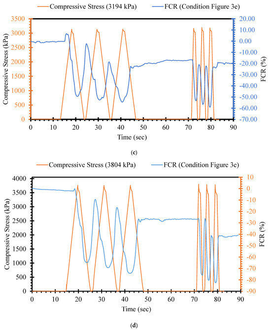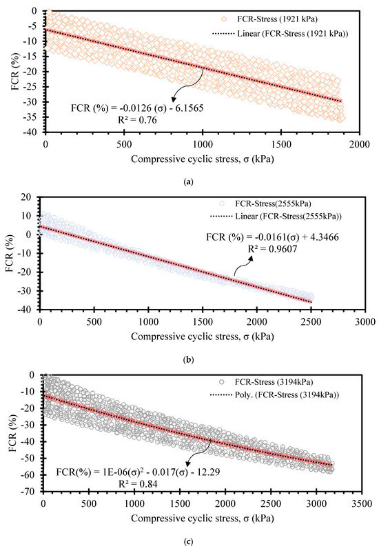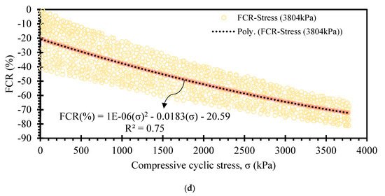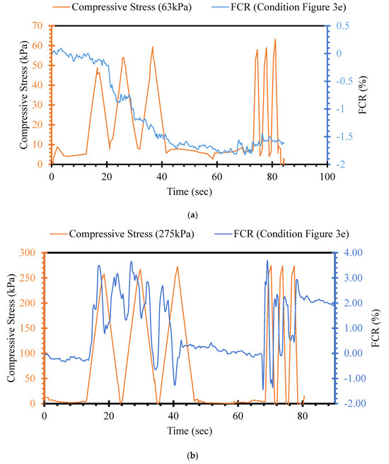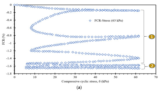 - The FCR suddenly decreased under the few cycles of the applied low stress level (63 kPa), and then it became constant under subsequent cycles of the same stress level. This issue can be attributed to the effects of accommodation that occurred under the first few cycles. Therefore, the accommodation effects at the beginning of loading must be considered in order to calibrate self-sensing cement-stabilized sand performance.