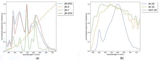 The digital photos were acquired in two scenarios: laboratory or controlled illumination conditions and in situ illuminants (corresponding with indoor and outdoor illuminants). The shots under controlled lighting took place in a Just Normlicht Color Viewing Light S PROFESSIONAL (JNCVLS) color cabin. The JNCVLS integrates illuminants approximately corresponding to the CIE standard D65, A, F11 (or TL84), and D50 []. Theoretical SPD data for standard illuminants are provided by the CIE []. However, it is highly recommended that actual measurements of the cabin illuminant be taken at the time of the photo. Thus, the SPD for all color cabin illuminants were measured using a Sekonic C-7000 SPECTROMASTER spectrometer (SEKONIC, Austria, Viena) and labeled using the prefix JN-, indicating that it is a color cabin illuminant, followed by the nomenclature of the standard illuminant, i.e., JN-D65, JN-A, JN-F, and JN-D50, respectively.