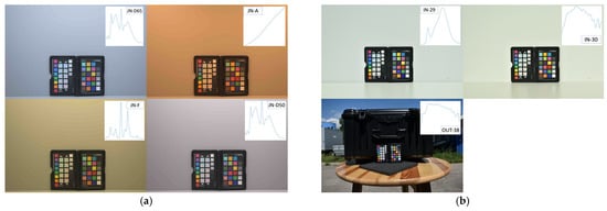 Nikon D5600 sample photos (displayed as fully rendered JPGs) of the XRCCPP under different light conditions (SPD of illuminant is showed at upper right for each image): (a) Laboratory settings: JN-D65, JN-A, JN-F, and JN-D50. (b) In situ settings: IN-29, IN-30, and OUT-38.