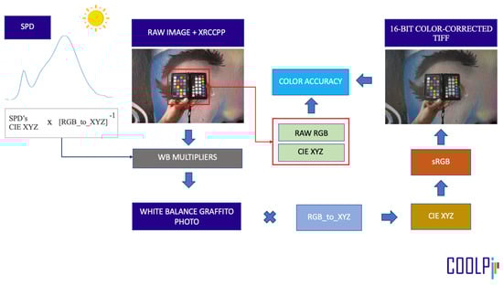 As a novel aspect of this study, the analysis and processing of the digital photos have been carried out entirely using the functionalities implemented in the COlor Operations Library for Processing Images or COOLPI package [,,]. COOLPI was created within the INDIGO project. Since one of the fundamental pillars of the INDIGO project was the creation of color-accurate digital orthophotos, the COOLPI package integrates classes, methods, and functions for color image correction.