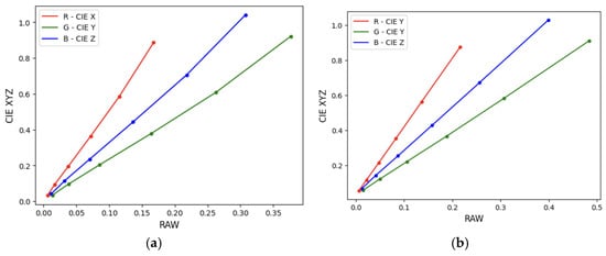 Although it is assumed that a camera’s RGB values are linearly related to the incident radiance, it is best to check this assumption. One way of doing this is by plotting the RGB values of the gray patches on the photographed color reference target against their measured CIE XYZ tristimulus values. Figure 6 depicts the outcome of this process for the Nikon D5600 using the XRPPCC and the CCDSG color reference targets. Both graphs show that no non-linearity correction is needed for the RAW RGB data [].