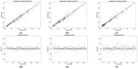 The model assessment metrics were computed using the test data. Since RMSE and residuals are in CIE XYZ units and do not necessarily reflect perceived visual errors, and since the CIELAB color space is approximately perceptually uniform, color difference metrics have been included to assess the colorimetric accuracy achieved after the adjustment [,,]. Thus, for calculating color differences, the 2° CIE XYZ predicted values must be transformed into the CIELAB color space (under illuminant D65) using the CIE formulation []. Conversion between color spaces is well-documented in the literature. We recommend following the method described in reference [] for a detailed analysis. The CIELAB space characterizes colors according to three parameters: L* for luminance, a* for the green–red chromaticity axis, and b* for the blue–yellow chromaticity axis. Two different color difference metrics were used: the legacy but often reported and the improved or CIEDE2000 [], which is the current industry standard.