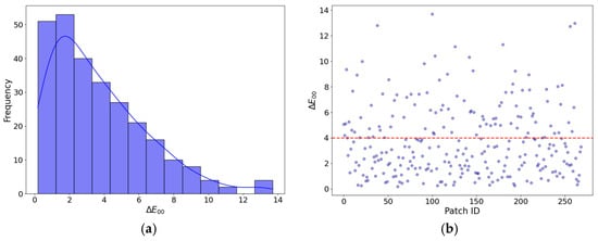 In order to evaluate the quality of the model fit, both the RMSE and the mean of the residuals in CIE XYZ units were analyzed, as well as the values of the color differences and to enable the adjustment’s evaluation from a colorimetric point of view. Different criteria can be considered in defining a maximum acceptable color difference, and these thresholds are often goal-specific. For example, Vrhel and Trussell set the threshold at ≤3 for color correction purposes [], while Song and Luo [] stablished ≤ 4.5 as the acceptability threshold when viewing images on a monitor. The digitization advice provided by the Metamorfoze Preservation Imaging Guidelines [] mentions an average color difference of ≤2.83 for the neutral patches and ≤4 for all patches of a CCDSG target. Using the latter guidelines—and in agreement with our experience in rock art documentation []—this paper uses an average threshold of ≤4. Although values from different color difference metrics should not be compared (they vary across the CIELAB colour space), and even though thresholds are usually tighter than their counterparts (see [] or a comparison of both metrics in dentistry), this paper adopts an average threshold of ≤4. The fact that the threshold is identical to the threshold is not only for ease of use, but also because it is in line with the − regression equation proposed by Lee and Powers for colour differences below 5 [].