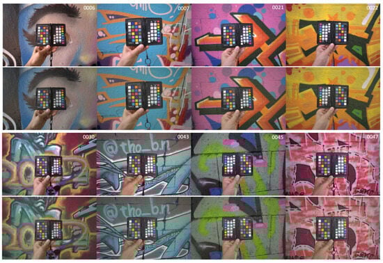 Application of the Nikon Z 7II transformation matrix to a sample of graffiti images. The upper photo of each pair is the in-camera-generated JPG photo, with its color-corrected version depicted below. The graffito ID is mentioned in the upper right corner of each photo pair.
