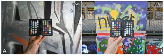 Upon obtaining the RGB-to-XYZ transformation matrix for the Nikon Z 7II camera (i.e., the in situ matrix, Table 11), the color transformation was applied to 45 photos of graffiti located along Vienna’s Donaukanal. These photos were acquired by a staff member of project INDIGO during one of the weekly photographic tours. INDIGO’s photographic tours aimed to document new graffiti that had appeared since the last tour. Since almost 13 km of urban surfaces had to be checked during each tour, data were collected relatively quickly and during all weather conditions. This is an important fact to consider because it means the data resulted from a practical, real-world scenario and were not just collected to optimize the colorimetric results. During a photographic tour, each new graffito was documented as follows []. First, an XRCCPP target was photographed in front of the graffito, so the target received the same illumination as the graffito. Then, the graffito’s spectral illumination was measured with a Sekonic C-7000 SPECTROMASTER spectrometer. Finally, the graffito was photographed from all possible sides, enabling the creation of a textured 3D surface model and an orthophotograph. This test utilizes the XRCCPP color chart and the illumination’s SPD of 45 new graffiti documented on 22 July 2022.