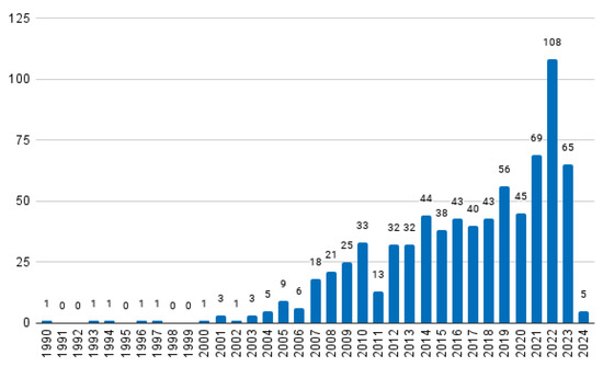 The earliest paper dates to 1990, and thus, a potential total of 35 papers could be selected (the most relevant per year between the years of 1990 and 2024). The distribution of the total number of papers retrieved per year is given in Figure 1. As can be seen, some years do not have any papers, and thus a total of 30 documents were finally included in the historical review. It is also clear that interest in the topic has increased over the years.