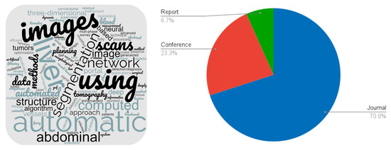 A word cloud constructed from the titles of the selected papers is shown on the left side of Figure 2. On the right side is a pie chart showing the number of journals, conference proceedings and reports.