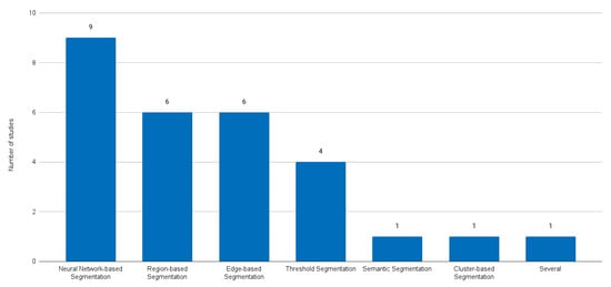 Several taxonomies can be used to characterise the reviewed papers. We decided to adopt the taxonomy introduced in a recent paper by Sakshi and Kukreja (2023) [18], published in the reputable journal Archives of Computational Methods in Engineering (Impact Factor of 9.7). Figure 3 shows the selected papers categorised by image segmentation technique according to this taxonomy.
