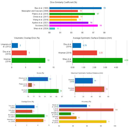 A summary of the papers reviewed in Section 3.1 is given in Table 1. The columns of the table contain the following information: identification of each study (column Authors); publication year (column Year); general category or approach used in the segmentation method as defined in [18] (column Segmentation Category); the specific segmentation technique or algorithm (column Method); whether the method is fully-automatic or semi-automatic (column Autom. Level for Automation Level); whether the segmentation is performed in 2D or 3D (column Dim. for Dimensionality); the dataset or database used for evaluation (column Database); and the key results of the best segmentation method in each paper (column Results). Graphical depictions of the metrics used in one or more studies are shown in Figure 4.